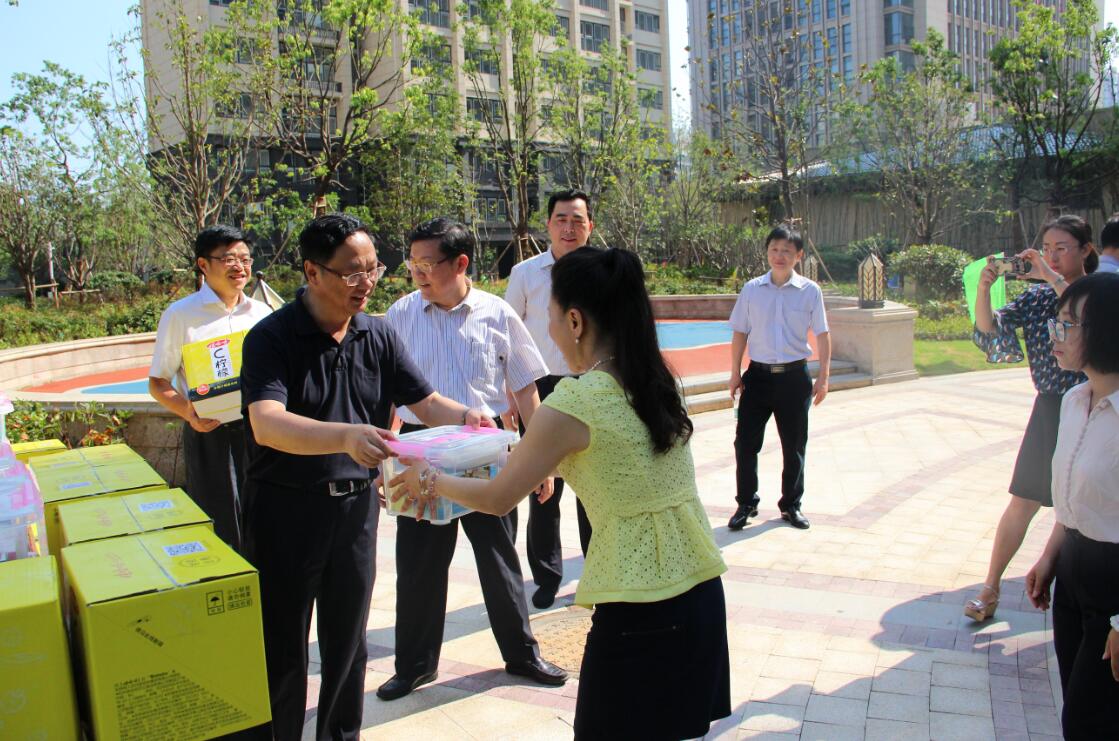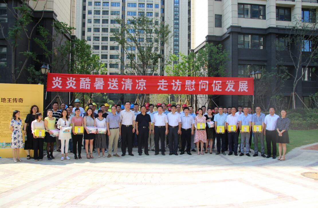 7月25日,苏豪控股集团党委书记、董事长王正喜、控股集团副总裁、建设集团党委书记周谦一行冒着近四十度的高温前往建设集团尚书云邸项目,为员工送去清凉和关爱。在“送清凉”活动中,王董事长代表集团党委、工会为员工们赠送了防暑降温药品和饮料等清凉物品。慰问活动结束后,王董事长一行在项目内进行了实地调研,并听取了工作进展情况汇报,王正喜董事长对建设集团爱涛置业公司房地产开发快速高效的工作给予了充分的肯定,并向全体员工致以诚挚敬意和衷心的感谢。王董事长强调,今年暑运期间温度高,外部作业人员面临严峻考验,各部门领导、各级管理人员务必要重视防暑降温工作,心系一线员工,合理安排员工上岗时间。在防暑降温措施上,不仅限于送清凉,要关注重点岗位工作需求,让广大员工平安度过高温季节。